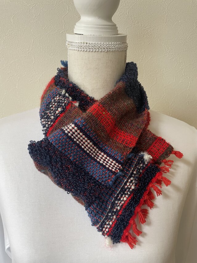 トリコロールカラーの糸が、ところどころに入り混じり、楽しい模様になっています。