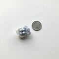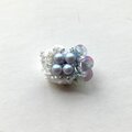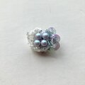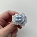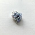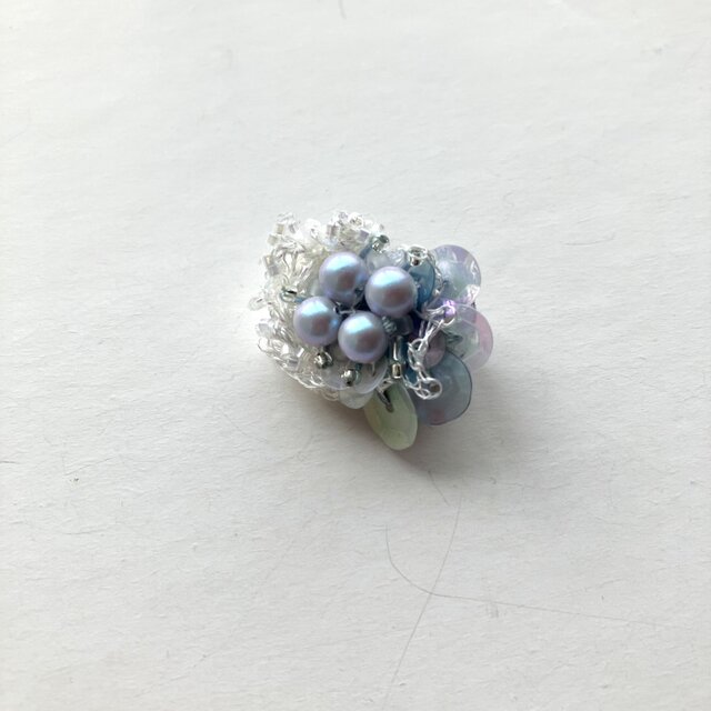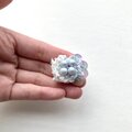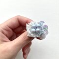 朝の光の色味のような青み感のあるパールビーズを中心に光の加減でオーロラ調の輝きのある大きさのあるスパンコールを合わせました。輝き方が美しいブローチです。ホワイトにオーロラ調の輝きを持つ糸を編み合わせ、角砂糖のようなキラキラとしたちいさなガラスビーズを加えています。