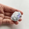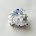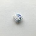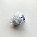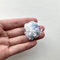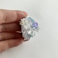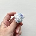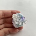 全体にもりもりとさまざなビーズを散りばめて、室内で動かしてもきらきらするようなブローチにしました。中央にはさまざまなビーズを合わせ立体感のあるデザインに。光が当たることで紫色に変化するカラーチェンジビーズを一粒合わせました。AAAクリスタルガラスになるので、室内で見ていてもとてもきれいです。ふだんは薄いブルー、光が当たると紫になります。刺繍面にはオーロラカラーの糸を編みあわせた面と、下部には薄いブルーのメタリックカラーの糸を編みループさせました。