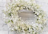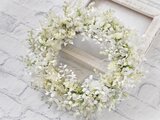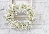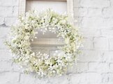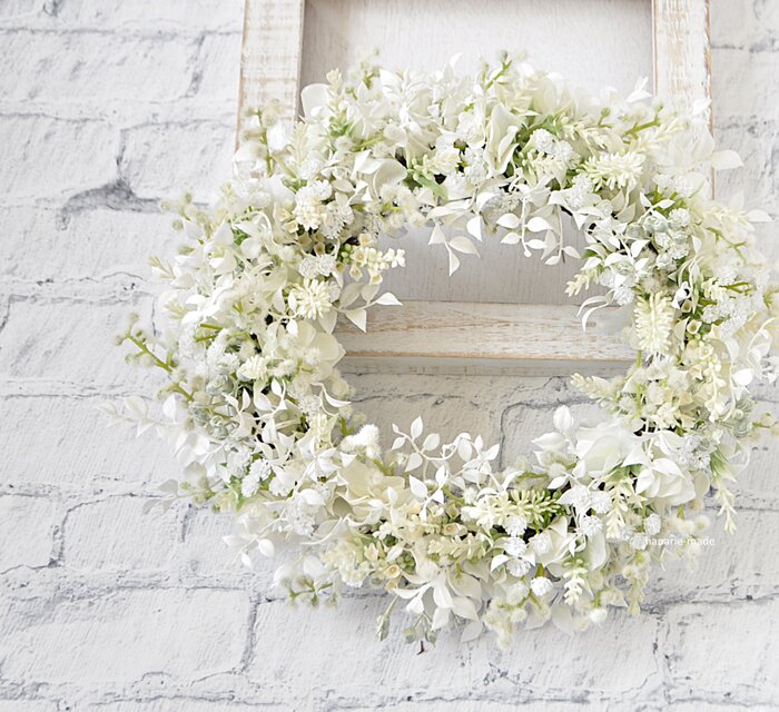 リース素材:アーティフィシャルフラワ-(造花):白いミモザ・かすみ草・ベロニカ・白い実・あじさい・白いスマイラックスなど。