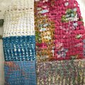 思いもよらないグラデーションになるアンティークな生地のかけらを集めて小さなコースターを作りました。