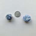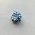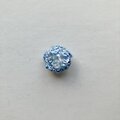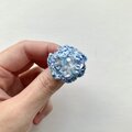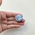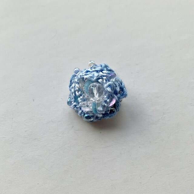 中央にはなめらかなファセットガラスでつくるビーズをひとつぶ。周りには淡いブルーやホワイトの小さなスパンコールを。全体は光沢のある糸を編んだもの、まわりにはラメ感のある糸とマットなブルーを合わせた糸で構成しています。