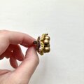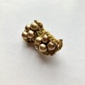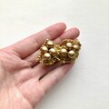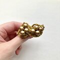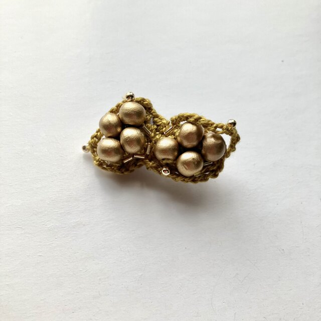 ブロンズカラーのウッドビーズを8つ。お豆のようにもみえます。からし色のあたたかみのあり糸を編み、形作っています。ちいさなゴールドの丸いビーズをつけ、可愛らしさも加えました。