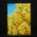 「青い空とミモザ」は、春の訪れを感じさせる特別な油絵です。F4号キャンバスに描かれたこの作品は、ホルベインの油絵の具が持つ鮮やかな色彩と独特のマチエールによって、一目見ただけで心を奪われる魅力を放っています。大部分を占めるミモザの群生は、色とりどりの黄色やオレンジ、緑といった暖色系が幾層にも重ねられ、立体感あふれる表現が特徴です。