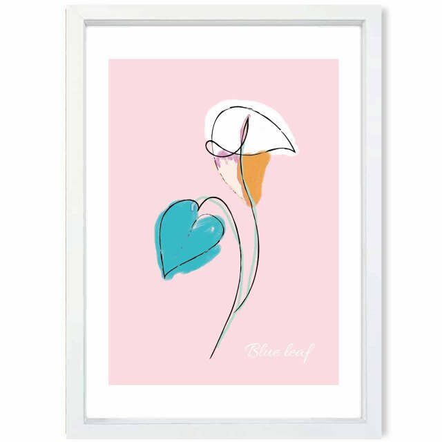 やさしいラインとラフな色彩で描いたブルーリーフ インテリアポスター。