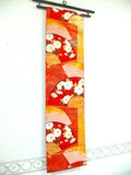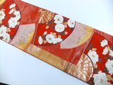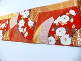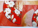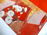 ■新品の帯をリメイクしました。鮮やかな赤地に扇面、菊などの吉祥文様で金糸も鮮やかで高級感のある帯地です。