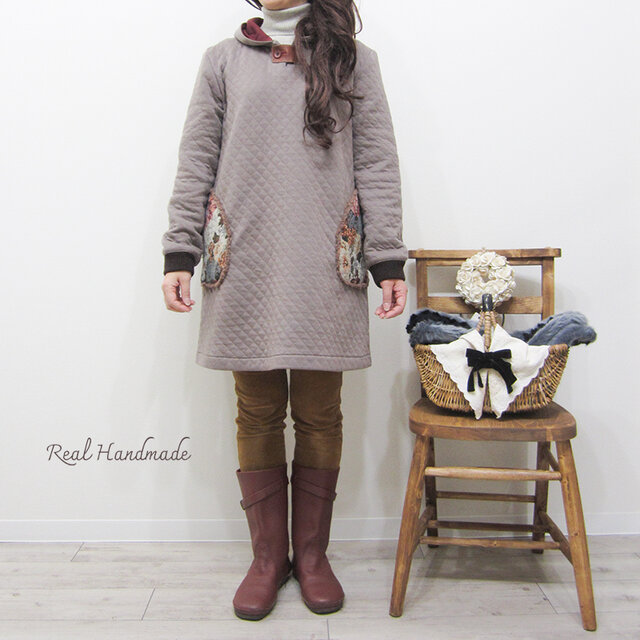 ふんわり柔らかなキルトニットモカにゴブランローズ、ボアを合わせてパーカーワンピースをハンドメイドしました♪