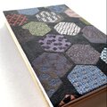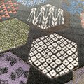 六角形を基調とした亀甲文様の区画の中に、日本古来より受け継がれてきた数種類の吉祥文様を組み合わせた、意味深い織柄が配されています。矢絣、七宝、鱗紋、唐草といった文様がそれぞれに由来と象徴性を持ちながら配置され、吉祥の意味が幾重にも折り重なる構成を狙いました。