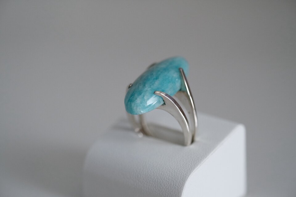 穏やかなブルーグリーンの輝きを持つアマゾナイトをモダンかつ立体的なフォルムで仕上げたsv925のアームかわアマゾナイトを包み込みように支えています。石の美しさを最大限に引き出す様、角度や高さにこだわって設計しました。シンプルながら洗練された印象でナチュラル系からモードスタイルまで幅広く馴染みます。