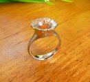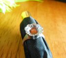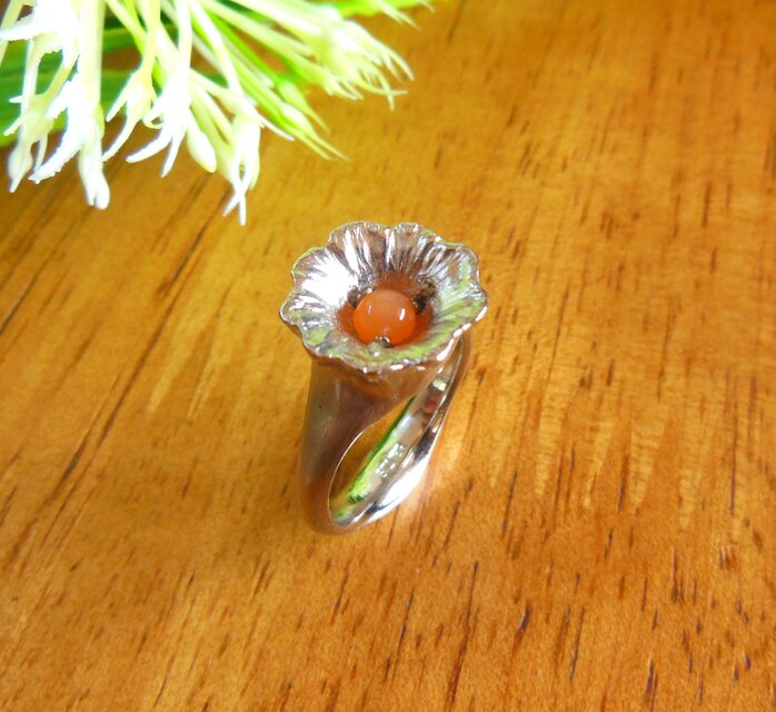 花をモチーフにしたオレンジ色のムーンストーンのリングです。角度によりキャッツアイ効果が出ます。