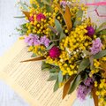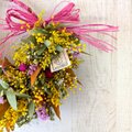 花材:ミモザ・カスミソウ・ユーカリ・千日紅・グレビレア・ゴールド