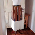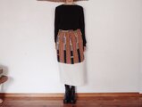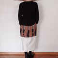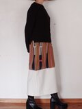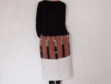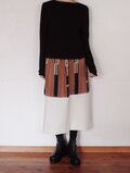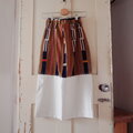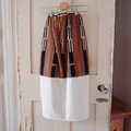 ストンとしたスカートですが前後のセンターにタックがあり、形をふんわりさせています。休日にも職場でも活躍しそうです!大人しめながらも白の使い方でアフリカンデザインを強調しています。ウエストはゴムですのでとても着心地が良く脱ぎ着も楽です。ゴムサイズは緩めにしていますので必要であれば調整ください。ポケットの内布は手触りの良い兵庫県西脇市の伝統先染め織布播州織を使用しています。