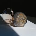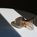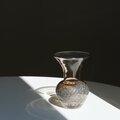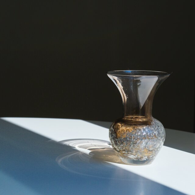 淡いスモークブラウンの色合いと、光の具合でシルバーに見える気泡の色合いが、上品で落ち着いた雰囲気を醸し出します。小ぶりなサイズながら、花を活けずオブジェとしても成立する、ミニマルで洗練されたデザインです。