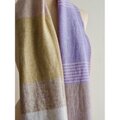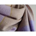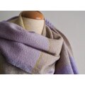 左右で経糸の色をホワイトとベージュに変え、緯糸にイエロー、ベージュ、パープルなどを合わせたヘリンボーン柄の大判ストール。巻くたびに違ってみえるデザインをお楽しみいただけるよう場所により色味やデザインを変えています。