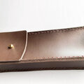 硬さと厚みのあるしっかりとしたダークブラウン牛スムースレザーを使用した