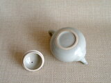 この注器は、信楽の土を使いろくろで作っています。美しい白色を出すために、京都清水で学んだ薄作りの技法を用い丁寧に削り釉薬をかけて仕上げています。内側にも釉薬をかけて細かい茶こし穴を開けています。丸みのある形が手になじみ、軽くて注ぎやすく湯切れも抜群です。蓋もすり合わせが良くぴったりです。作陶から仕上げまで時間をかけて完成させています。小川流煎茶を長年習った経験を活かして丁寧に仕上げています。