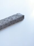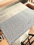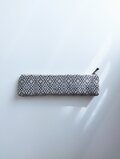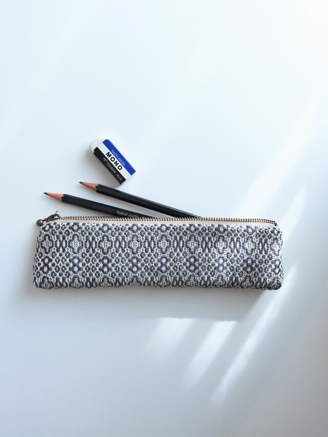 経糸に白い綿糸、緯糸にはシックなダークグレーの麻糸(苧麻)を用い、オーバーショット織りでペンケースに仕立てました。