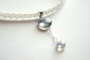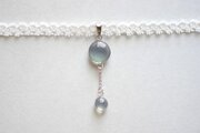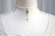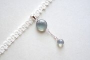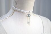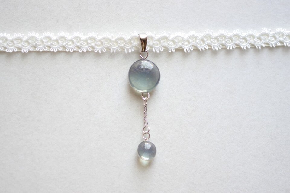 ぷっくり張りつめた大小の水滴のような透明感に魅入ってしまうレジンを、サテンリボンにタティングレースで装飾を施したチョーカーに仕上げました。