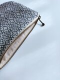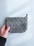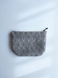 経糸に白い綿糸、緯糸にはダークグレーの麻糸(苧麻)を用い、オーバーショット織りで使いやすいサイズのポーチに仕立てました。