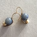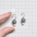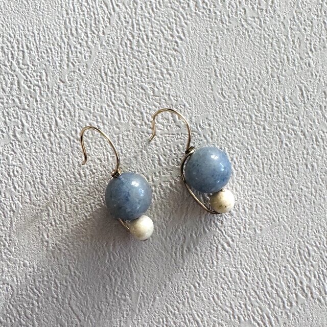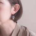ブルーアベンチュリンとマーブルビーズを組み合わせ、コンパクトながらもバイカラーで印象的なデザインに仕立てました。二種類の天然石が組み合わせることで、高級感と存在感を感じます。ブルーグレーとベージュのくすみカラーもまた、絶妙な色合いです。