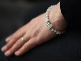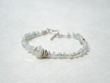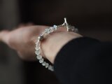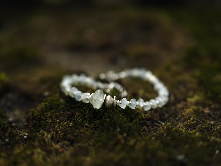 形の不揃いのムーンストーン・ロンデルと淡水ケシパール、極小シルバービーズを組み合わせ、優しい色味とシルエットが目をひく天然石ブレスレットに仕立てました。
