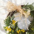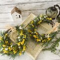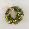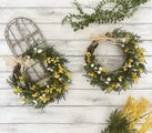 見ているだけで心がパッと明るくなるようなミモザに、可憐な白い小花と表情豊かな数種類のグリーンを合わせ、ナチュラルで上質なリースに仕立てました。