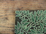 板状の粘土に白い化粧泥を掛けてからナナカマドを描き余分な化粧泥は削り落として図柄だけを残しています。