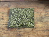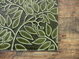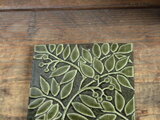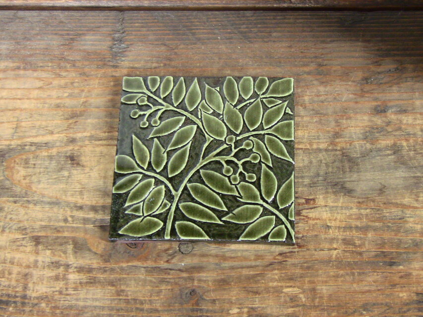 板状の粘土に白い化粧泥を掛けてからナナカマドを描き余分な化粧泥は削り落として図柄だけを残しています。