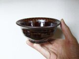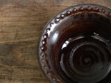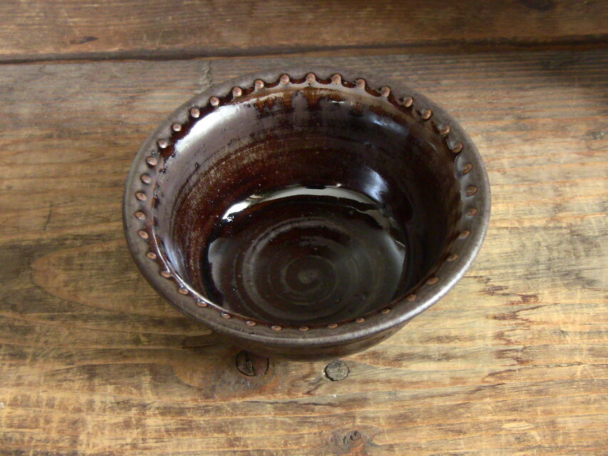 素地に化粧泥を掛けてから口縁部分に点打ちを施し鉄錆釉を掛けて焼成しています。