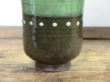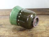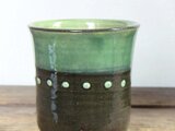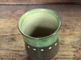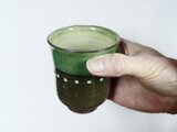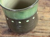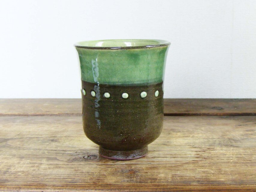 素地に化粧泥を掛けてから胴回りに点打ちを施し織部釉とブーベリー釉を掛けて焼成しています。