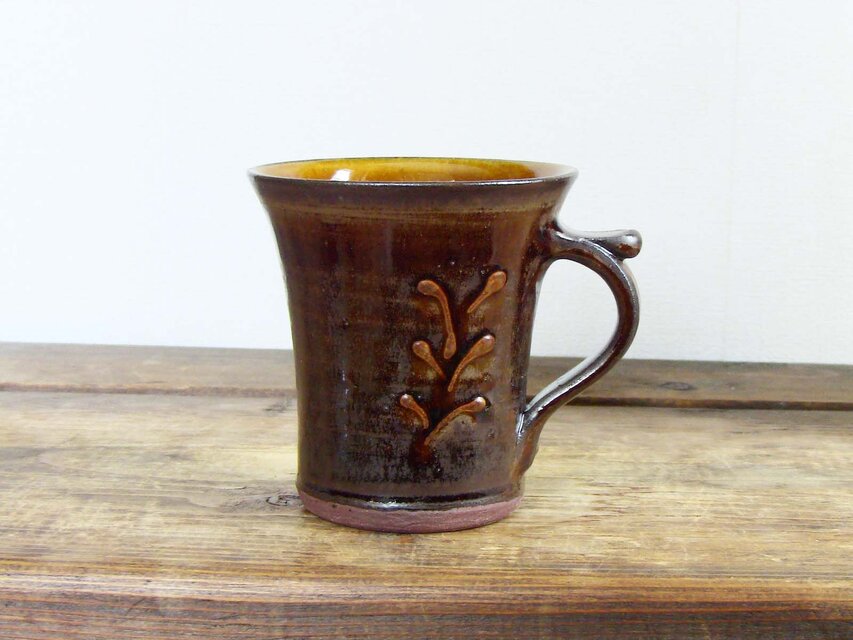 化粧泥は北海道蘭越町で採掘した白粘土を使用し、釉薬には自家製灰をブレンドした鉄錆釉と飴釉を使用。