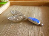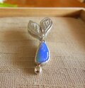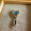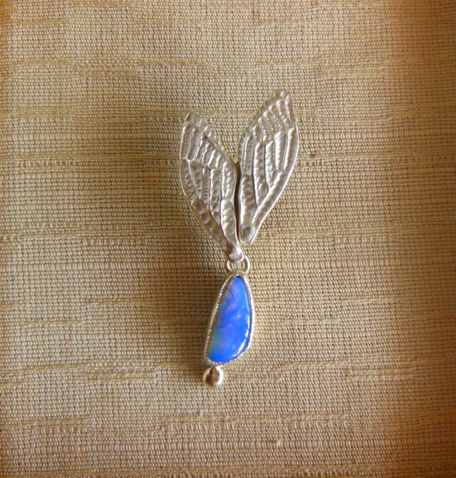 ボルダーオパールのブローチです。蝉の羽の下にぶら下がっています。蝉の羽は打ち出しという技法で作ってあります。ボルダーオパールとは母岩にくっついているオパールで、