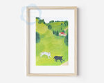 2匹の犬がいる高原の風景を水彩絵の具で描きました