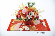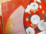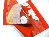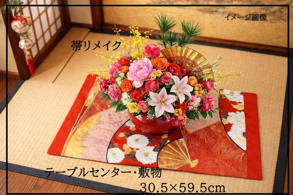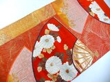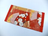 ■新品の帯をリメイクしました。鮮やかな赤地に扇面、菊などの吉祥文様で金糸も鮮やかで高級感のある帯地です。