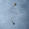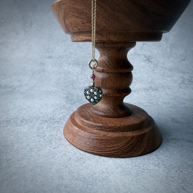 上部に添えられた小さなルビー、その下に静かに揺れるハートモチーフ。