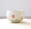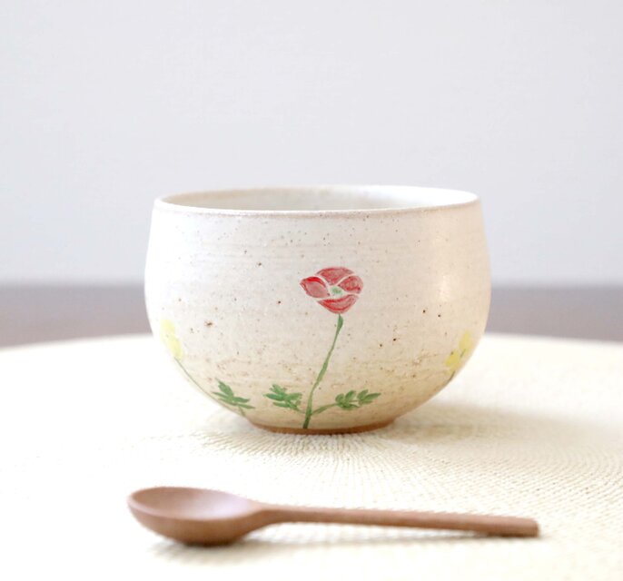 ころんと丸いお湯呑みの形に成形後、ポピーをイメージした彫り模様を施しました。