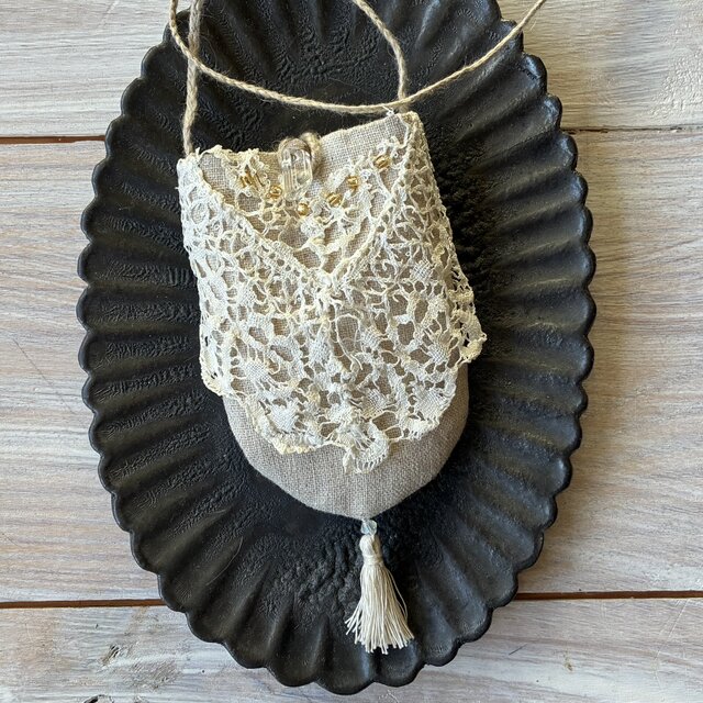 入り口は、リネン紐をを引っかけてボタンとしてお使いいただけます。