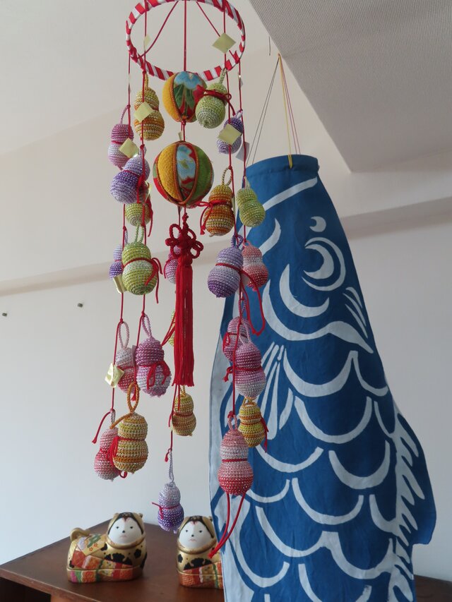口元には3種類(紅、黄、紺)の飾り紐を用いて吹き流しを表現しております。