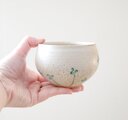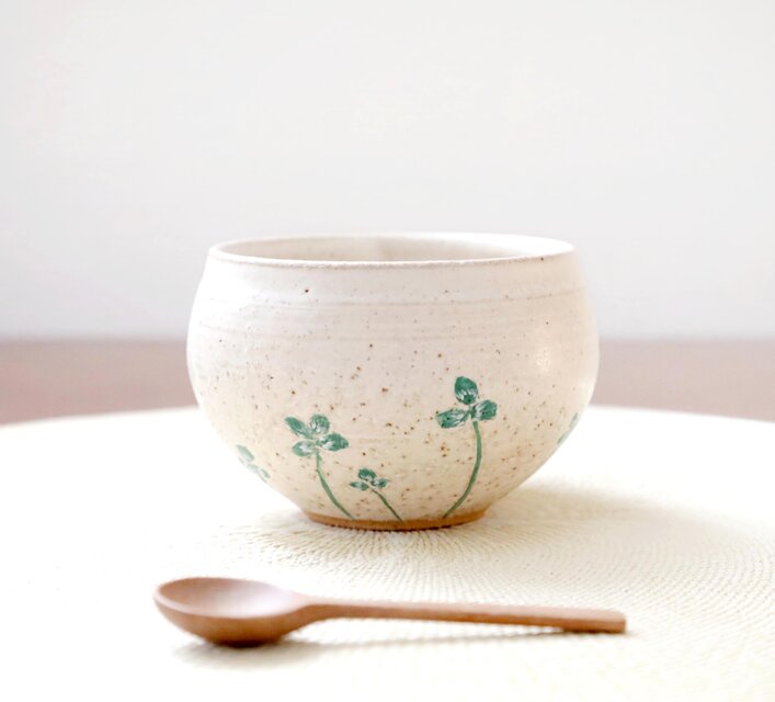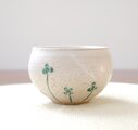 ころんと丸いお湯呑みの形に成形後、クローバーをイメージした彫り模様を施しました。三つ葉の中に四つ葉も散りばめています。