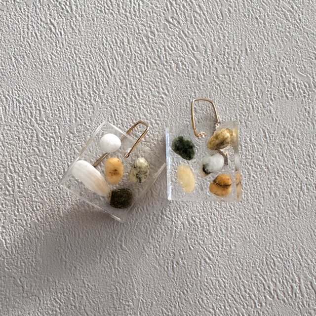 レジンの中に何を閉じ込めようかな?と考え、アースカラーの石を並べて閉じ込めてみたくなりました。手間のかかる作業ですが、ひとつひとつレジンの中に並べて沈めていくのがとても楽しくて、製作するときのときめきも閉じ込めてお届けします。