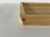 接合部には「通しホゾ」(写真4枚目)を採用。強度はもちろん、木材のコントラストがデザインのアクセントになっています。左右の縁をあえて傾斜させることで指にかかりやすく、持ち上げやすい形に仕上げました。