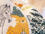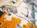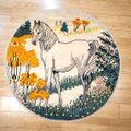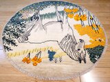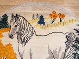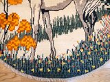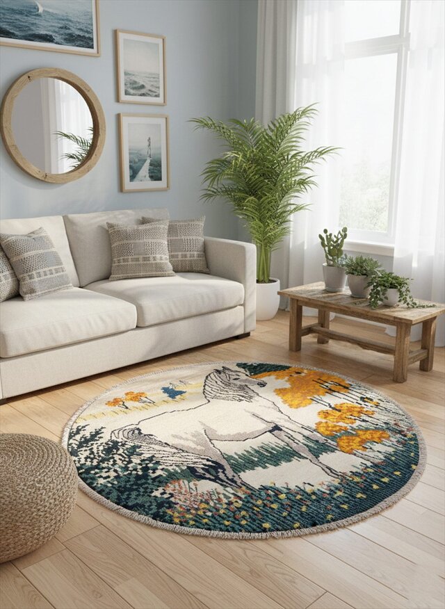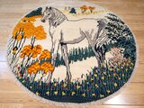 円形のキャンバスいっぱいに描かれた、凛とした白馬。ギャッベにおいて馬は「幸運」や「物事がうまく進む」象徴とされています。毛並みを表現した繊細な織り込みと、今にも動き出しそうな躍動感は、まるで一枚の絵画。お部屋に敷くだけで、そこは自分だけの特別なギャラリーに変わります。