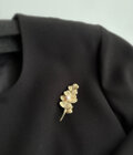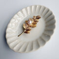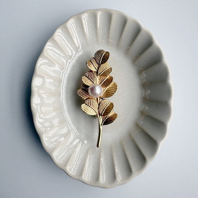 フレッシュヴィンテージゴールドのような若々しい印象を与える色合いのリーフ。使用したあこやパールは小さいながらも艶やかさは充分、普段使いにワンポイントとしてお使い頂けます。人気リーフモチーフのパールブローチ。
