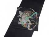 ■意匠:雷神図 太鼓を打ち鳴らし、光を放つ雷神の姿をダイナミックに表現しました。古来より「厄除け」や「五穀豊穣」の象徴とされる雷神は、身に纏うだけで力が湧いてくるような縁起の良いモチーフ。繊細な色使いが、黒地の帯に立体的な奥行きを生んでいます。