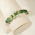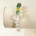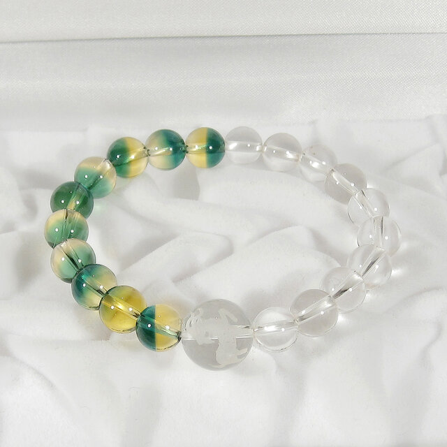 2色に着色された透明感の綺麗な溶錬水晶(練り水晶)のグリーンシトリンクォーツと、鹿が彫られた透明感の高い本水晶(天然水晶、天然石)のブレスレットです。