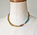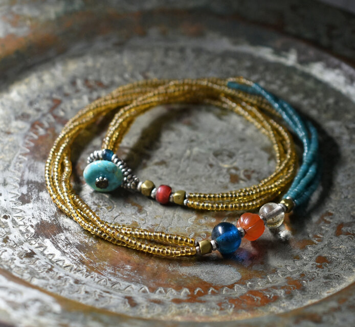 素材:ガラス、ヴィンテージカーネリアン、カレンシルバー、oldオリッサブラス、ターコイズ、ロウビキ紐