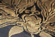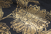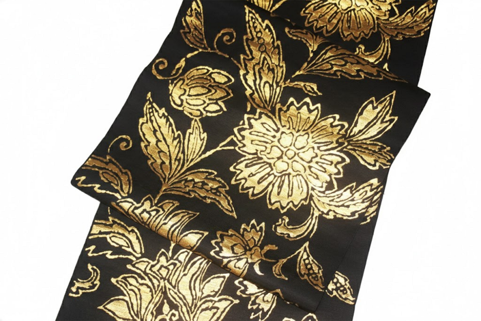 凛とした黒に咲く、優美な一輪。装いに華やぎを。 漆黒の地に、繊細な織りで表現された大輪の花々。甘さを抑えたモノトーンの配色は、大人の女性にふさわしい「気品」と「可愛らしさ」を絶妙に調和させています。