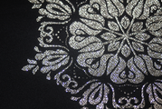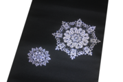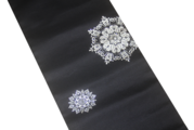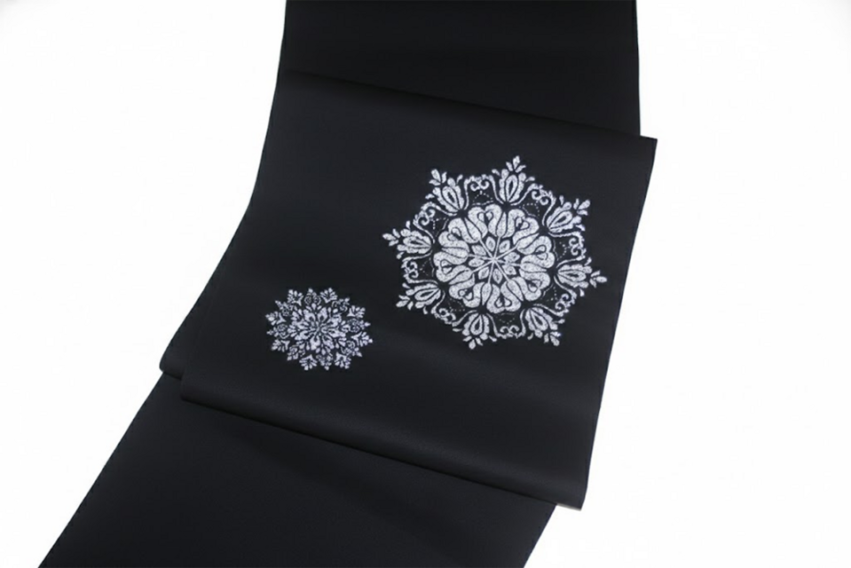 凛とした黒に咲く、銀の結晶。装いを気高く、エレガントに。 京都・西陣の職人が、伝統的な「華紋(かもん)」を現代的な感性で織り上げました。漆黒の地に精密に配された銀の意匠は、光の角度によって真珠のような上品な光沢を放ち、お顔まわりを華やかに演出します。