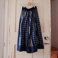 帯状の生地を繋ぎ合わせた裾やウエスト部分はミシンで補強していますが、その他ほつれや汚れなどがある場合がございます。またミシンで縫えない箇所は手縫いをしています。お洗濯は、優しく水で手洗いして、すぐに乾かすと色落ちはほとんどありません(浸け置きやお湯洗いは避けてください。)年数が経つとほつれなどが生じる可能性もありますが、修繕しながら経年の変化もお楽しみいただける味のある生地です。