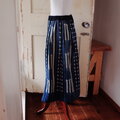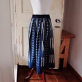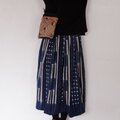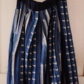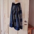 藍染めを制作しているボボ族はアフリカ西部のブルキナファソに住む民族です。手織りの帯状の布を継いで1枚の布にし、絞り染めを施します。天然の藍には防虫効果(蚊除け)もあるそうで、西アフリカ各地で昔から藍染め布が制作されています。デザインや染め方などバライティーに富んでおり、見ているだけでも楽しくなるアフリカンデザインです。